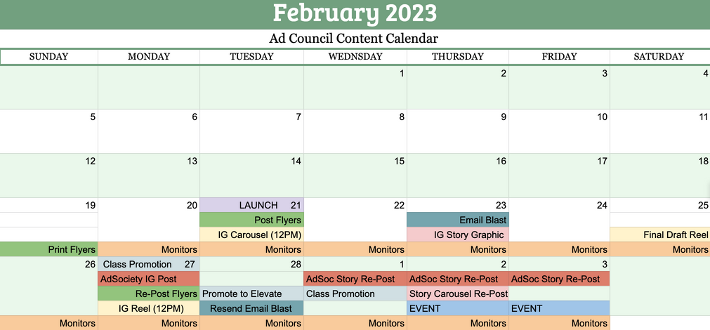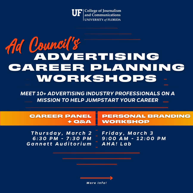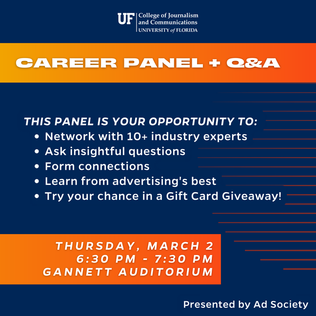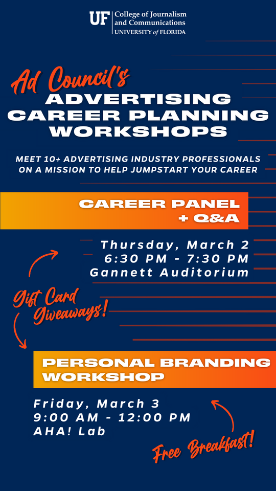 Led a Director's team of 6 to create & execute a campaign in 1 month for the UF CJC Ad Advisory Council's Spring 2023 Panel. As the Account Management Director, my role was to heavily communicate all the steps of the way to forming this campaign with Ad Council, ensuring action items were consistently met within this short period, and implementing the client's needs at all times. Ad Council consists of a group of 15-20 advertising industry professionals who want to provide professional career guidance to UF Ad majors. Using social media, OOH ads, listservs, and our personal student resources, we grew event attendance by 30% and increased overall awareness about Ad Council's purpose among Ad majors by 40%. Emphasizing their expertise, communicating all of the event information cohesively, and reaching as many Ad majors and ad-curious students as possible, we cultivated over 3,500 cumulative impressions! What I learned the most from this campaign was the importance of having a playful, healthy, communicative bond with your team. Our relationship is what drove our passion for this project and helped us feed off of each other's creative energies throughout the campaign. To view more campaign results, deliverables, strategy findings, and content calendars, click above!